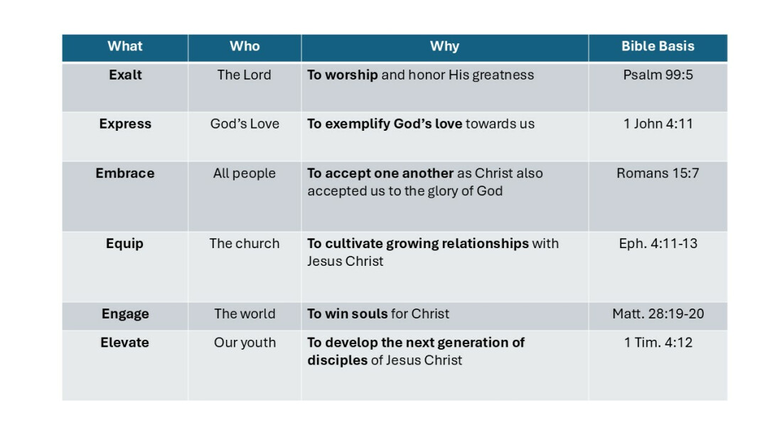 To develop members who promote unity, live a life that pleases God, and set a spiritual tone and tempo for worship that prepares the hearts of God's people to receive His Word.
